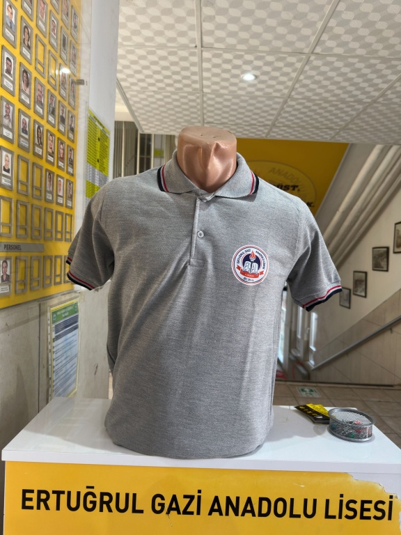 1. Gri renk, polo yakalı, kısa veya uzun kollu (uzun kollu ise kol ucu manşetli), pamuklu, yünlü, keten vb. doğal ve sağlıklı kumaşlardan üretilmiş yakası lacivert ve bordo çizgili tişört.